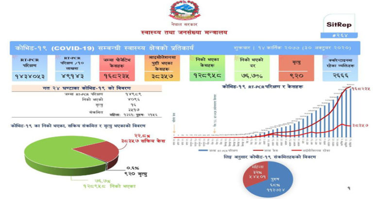 काठमाडौं, १४ कात्तिक । नेपालमा पछिल्लो २४ घण्टामा देशभर ३५१७ जनामा कोरोना भाइरस (कोभिड-१९) संक्रमण पुष्टि भएको छ । यो अवधिमा १४ हजार ९८९ जनाको परीक्षण गर्दा २१५६ पुरुष र १३६१ महिला गरी ३५१७ जनामा संक्रमण पुष्टि भएको स्वास्थ्य तथा जनसंख्या मन्त्रालयले जनाएको छ ।