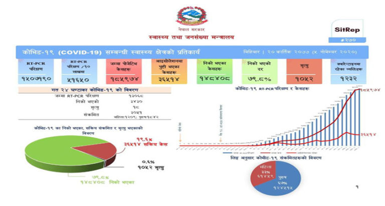 मन्त्रालयको तथ्यकमा उल्लेख गरे अनुसार यससँगै नेपालमा कोरोना संक्रमितको कुल १ लाख ८५ हजार ९७४ पुगेको छ । पछिल्लो २४ घण्टामा थप ३४३० जना निको भएसँगै संक्रमणमुक्त हुनेको कुल संख्या १ लाख ४८ हजार ४०८ पुगेको छ । हाल देशभर सक्रिय संक्रमित ३६ हजार ५१४ जना रहेको पनि मन्त्रालयले जनाएको छ ।