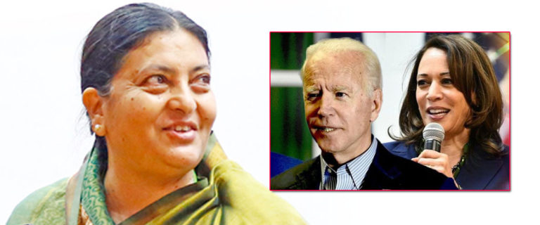 काठमाडौँ, २३ कात्तिक । राष्ट्रपति विद्यादेवी भण्डारीले संयुक्त राज्य अमेरिकाका राष्ट्रपतिमा निर्वाचित भएकोमा डेमोक्रेटिक पार्टीका नेता जो बाइडेन र उपराष्ट्रपतिमा निर्वाचित कमला ह्यारिसलाई बधाई ज्ञापन गरेका छन् ।