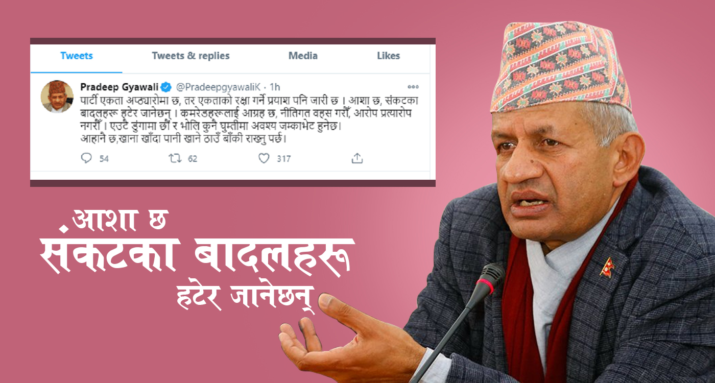 परराष्ट्रमन्त्री एवम् नेकपाका नेता प्रदीप ज्ञवालीले सामाजिक संजाल ट्वीटर मार्फत पार्टी एकता अप्ठ्यारो अवस्थामा रहेता पनि एकताको प्रयाश जारी रहेको जानकारी गराएका छन् ।