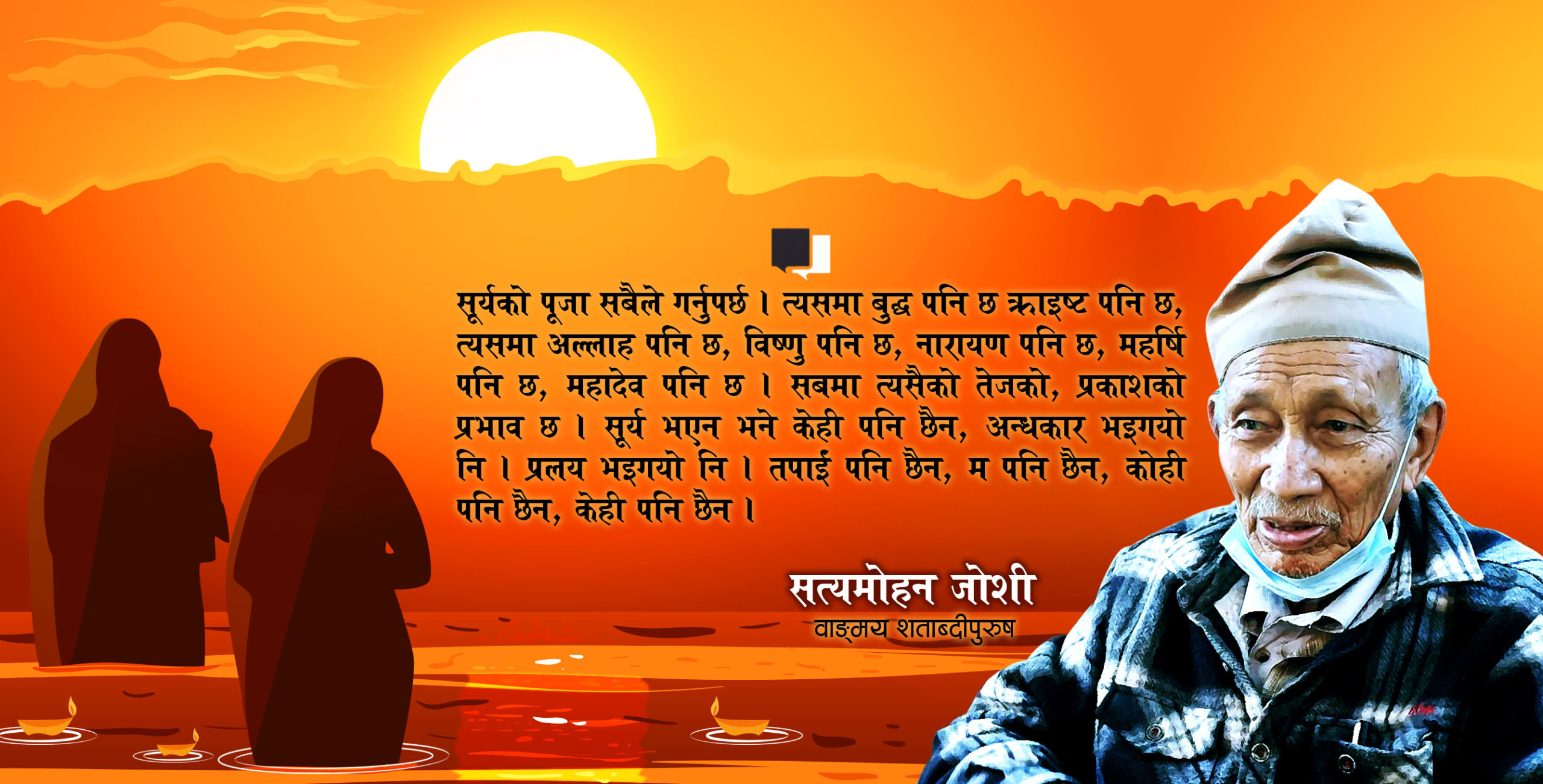 सूर्यको पूजा सबैले गर्नुपर्छ । त्यसमा बुद्ध पनि छ त्यसमा क्राइष्ट पनि छ, त्यसमा अल्लाह पनि छ, विष्णु पनि छ, नारायण पनि छ, महर्षि पनि छ, महादेव पनि छ । सबमा त्यसैको तेजको, प्रकाशको प्रभाव छ । सूर्य भएन भने केही पनि छैन, अन्धकार भइगयो नि । प्रलय भइगयो नि । तपाईं पनि छैन, म पनि छैन, कोही पनि छैन, केही पनि छैन – सत्यमोहन जोशी, वाङ्मय शताब्दी पुरुष