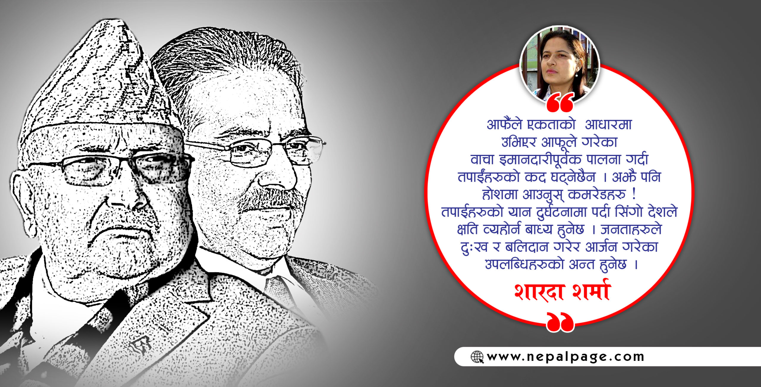 तपाईंहरुको ठूलो पार्टी, तपाईंहरुको एकलौटी सरकार साँच्चै जनताका आकांक्षाहरु पूरा गर्न केले रोक्यो रु र, यो ताण्डव नृत्य देखाउदै हुनुहुन्छ । आफैँले एकताको आधारमा उभिएर आफूले गरेका वाचा इमानदारीपूर्वक पालना गर्दा तपाईंहरुको कद घट्नेछैन । अझै पनि होशमा आउनुस् कमरेडहरु १ तपाईहरुको यान दुर्घटनामा पर्दा सिंगो देशले क्षति व्यहोर्न बाध्य हुनेछ । जनताहरुले दुःख र बलिदान गरेर आर्जन गरेका उपलब्धिहरुको अन्त हुनेछ – शारदा शर्मा