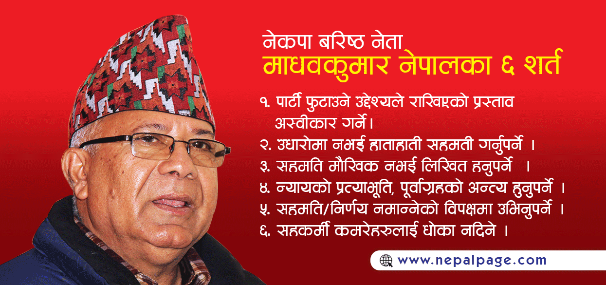 माधव नेपालको अन्तिम शर्त छ– सहकर्मी कमरेडहरुलाई धोका दिन्न । आफ्नो एजेण्डा, कार्यक्रम र अडानको पक्षमा रहेका नेताहरुलाई धोका दिएर अर्को कुनै प्रस्ताव स्वीकार गर्दिनँ । उनले भन्ने गरेका छन्, ‘पार्टीलाई विधि–पद्दतिमा चलाउनुपर्छ, गतिशील बनाउनुपर्छ भन्ने एजेण्डामा साथ दिने कमरेडहरुलाई धोका दिएर कुनै सहमति गर्दिनँ । कसैलाई अन्याय हुन दिन्न ।’
