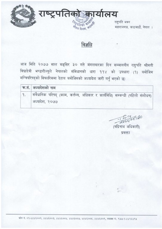 स्रोतका अनुसार प्रधानमन्त्री केपी शर्मा ओलीले आज विहान आकस्मिक रुपमा बोलाएको मन्त्रिपरिषद बैठकले संवैधानिक परिषद (काम, कर्तव्य, अधिकार र कार्यविधि) सम्बन्धी ऐनको दफा ६ को उपदफा ३ लाई संशोधन गर्ने गरी अध्यादेश सिफारिस गरेको हो । यसैबीच राष्ट्रपति विद्यादेवी भण्डारीले तत्कालै संवैधानिक परिषदसम्बन्धी अध्यादेश जारी गरेकी छन् ।