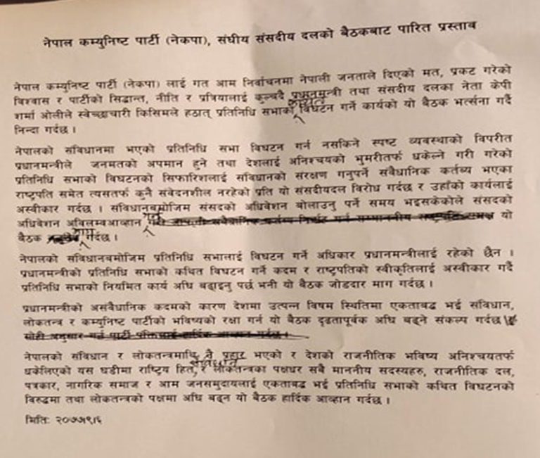 नेकपाका ११४ जना सांसदले प्रतिनिधिसभाको नियमित काम अघि बढाउने निश्कर्ष निकालेको हो । भेलाले प्रतिनिधिसभा विघटन गर्ने प्रधानमन्त्री र राष्ट्रपतिको कदमलाई अस्वीकार गरेको घोषणा गर्दै संसदको नियमित अधिवेश बोलाउन माग गरेको छ ।