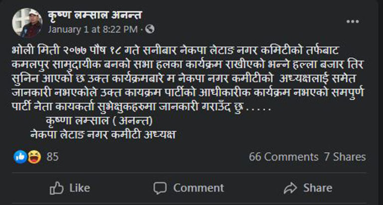नेपाल कम्युनिष्ट पार्टी (नेकपा)को आन्तरिक विवाद र कलह केन्द्र, प्रदेश हुँदै स्थानीय तह, वडासम्म पुगेको छ । पार्टीकै भ्रातृ संगठनमा पनि त्यसको प्रत्यक्ष र परोक्ष असर पर्दै गएको छ । अधिंकाश जिल्ला, पालिका र पार्टीको भातृ संगठनले छुट्टाछुट्टै भेला गर्न थालेका छन् । मूलत अहिले स्थानीय तहमा नेकपाको ३ पक्ष पाइन्छ । एकथरीले प्रचण्ड-माधब पक्षलाई पछ्याइरहेका छन् भने अर्कोथरीले केपी ओलीलाई सामर्थन गरिरहेका छन् । बाँकी रहेको एकथरी सूर्य चिन्ह वा पार्टीको नाम र सम्पत्ति जसले पाउँछ उसैसँग लाग्ने तयारीका साथ बसिरहेका छन् ।