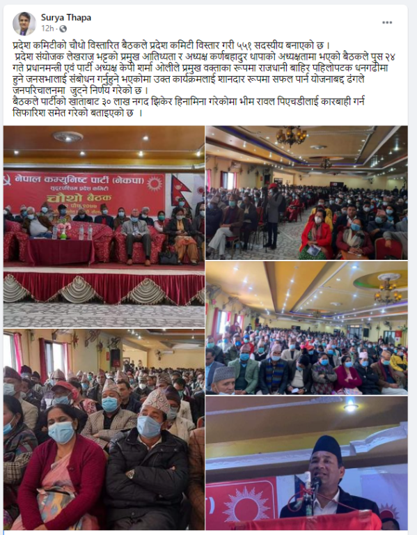 ‘बैठकले पार्टीको खाताबाट ३० लाख नगद झिकेर हिनामिना गरेकोमा भीम रावललाई कारबाही गर्न सिफारिशसमेत गरेको बताइएको छ,’ थापाले फेसबुकमा लेखेका छन्।