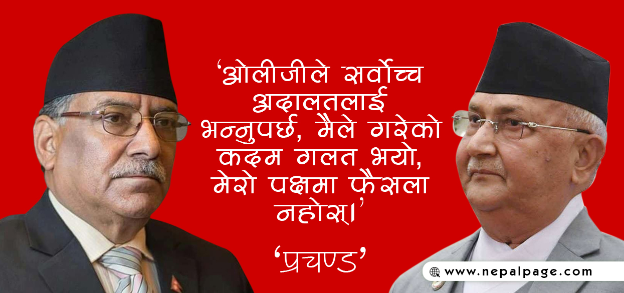 सम्बोधनका क्रममा प्रचण्डले भने, ‘ओलीजी गणतन्त्रवादी नभए पनि नेपालीहरू अझै गणतन्त्रवादी छन्, गणतन्त्र जोगाउनका लागि हामी अझै जीवित छौँ, ओलीजीले सर्वाेच्च अदालतलाई भन्नुपर्छ, मैले गरेको कदम गलत भयो, मेरो पक्षमा फैसला नहोस् । ’