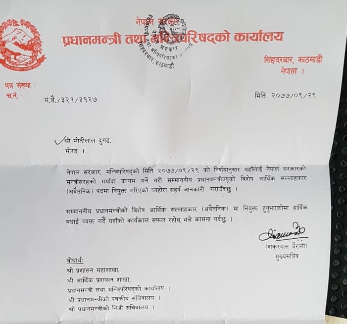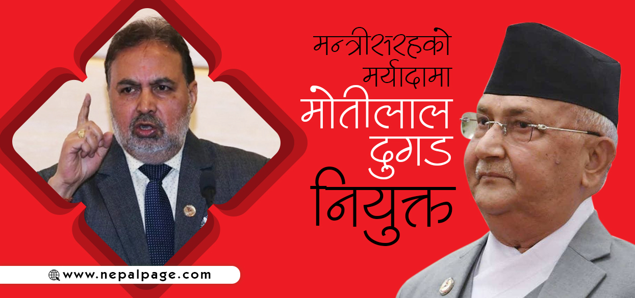 काठमाडौं : सरकारले पूर्व उद्योग वाणिज्य तथा आपूर्ति राज्यमन्त्री मोतीलाल दुगडलाई विशेष आर्थिक सल्लाहकारमा नियुक्त गरेको छ । पुस २९ मा बसेको मन्त्रिपरिषद्को बैठकले उनलाई नियुक्त गरेको हो ।