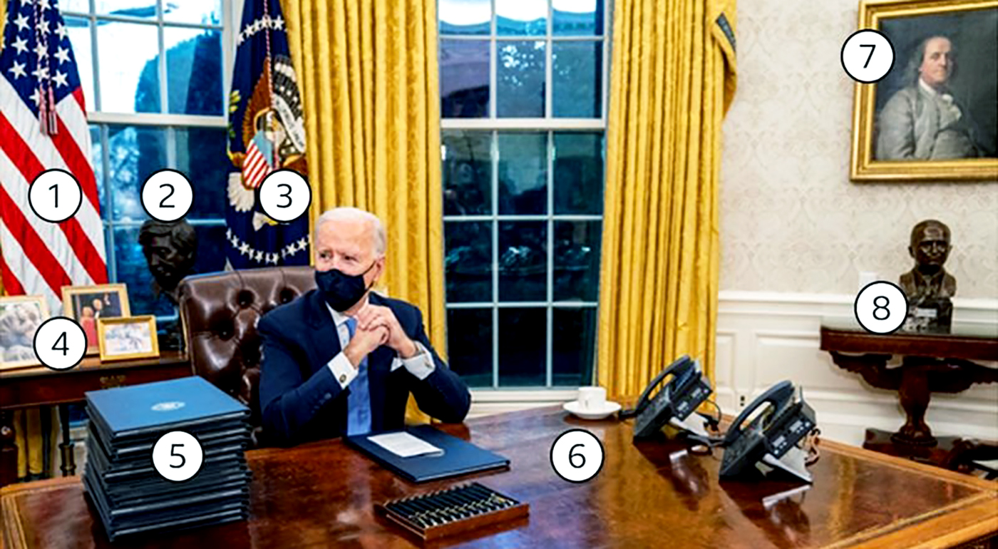 ओभल अफिसका नयाँ फोटोहरू हेरेपछि, धेरै व्यक्तिहरूले सोसल मिडियामा याद गरे कि जो बाइडनको कुर्सी पछाडिको टेबलमा मेक्सिकन–अमेरिकी मजदुर नेता सेसार चाभेजको मूर्ति र उनको परिवारका फोटोहरू रहेको छ ।