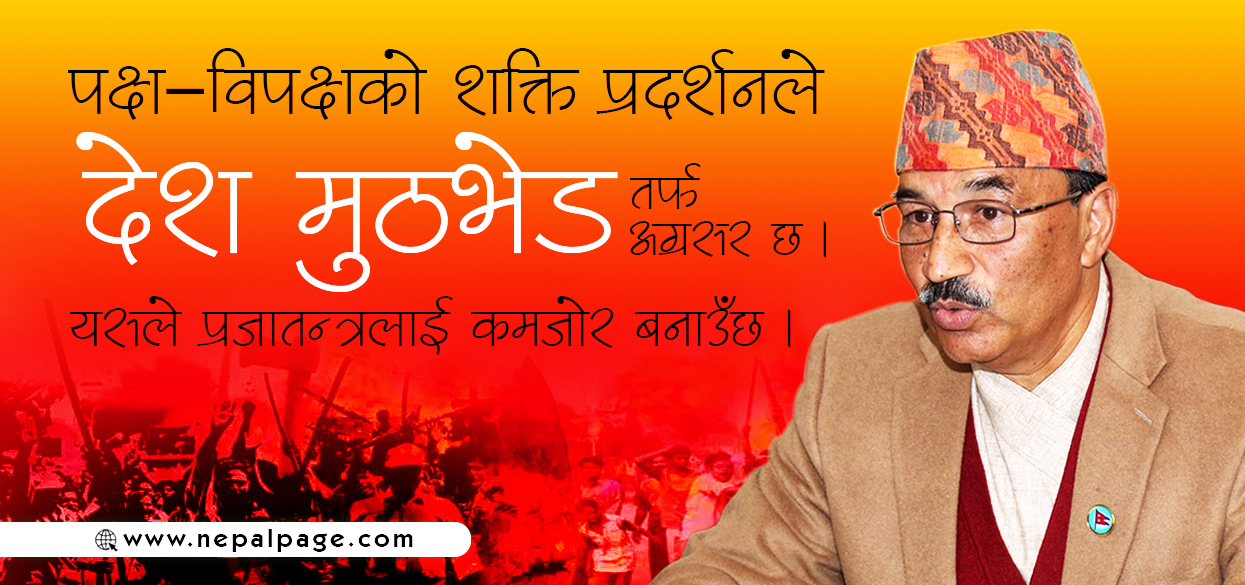 उनले पक्ष र विपक्षमा शक्तिको प्रदर्शन गर्ने प्रक्रियाले देशलाई अस्थिरता, अराजकता र मुठभेडतर्फ लैजाने खतरा बढेको बताए । उनले भने, ‘पक्ष-विपक्षको शक्ति प्रदर्शनले देश मुठभेडतर्फ जाने देखिएको छ । यसले प्रजातन्त्रलाई कमजोर बनाउँछ ।’ प्रजातन्त्र कमजोर बन्दा विदेशी शक्तिको चलखेल बड्ने उनको भनाइ थियो । उनले थपे, ‘अस्थिरता र अराजकता बढ्दै गएको अवस्थामा परिस्थिति राजनीतिक दल र नेताभन्दा बाहिर जान सक्ने खतरा देखिन्छ ।’