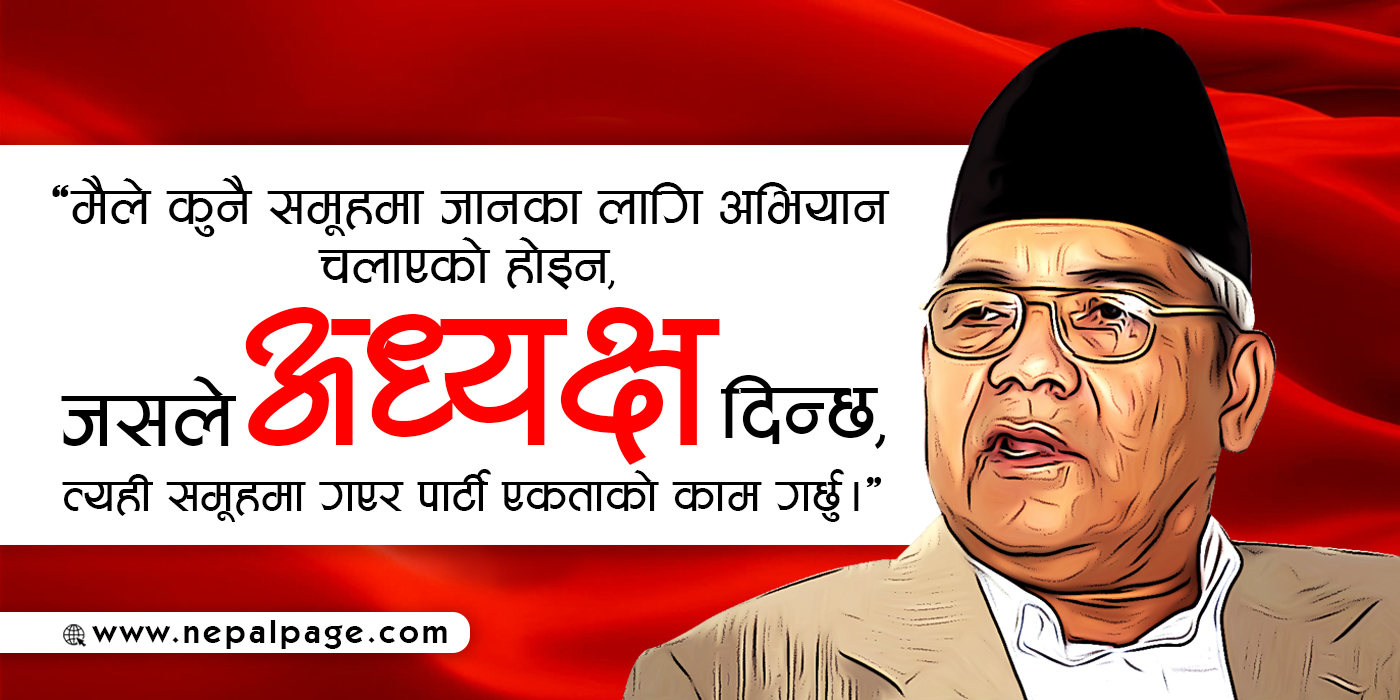 उनले तत्कालीन नेकपा (एमाले) र नेकपा माओवादी केन्द्रलाई पनि आफूले एक गराएको भन्दै पुनः अहिले फुट्न थालेको पार्टीलाई पनि एक बनाउने प्रतिबद्धता व्यक्त गरे । ‘त्यतिबेला नै मैले एमाले र माओवादी केन्द्रलाई एक बनाई नेकपा बनाएको थिएँ,’ उनले भने, ‘अब पनि एकता अभियानबाट म दुवै समूहलाई एकतामा ल्याउँछु ।’ उनले ओली र दाहाल–नेपाल समूह दुवैको जित हुने गरी अबको एकता हुने बताए ।