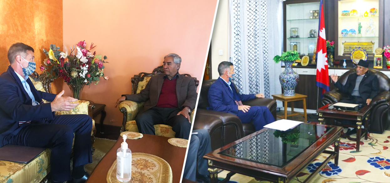 राजदूत बेरीले सोमबार नेपाली कांग्रेसका सभापति शेरबहादुर देउवा र नेकपाका अध्यक्ष पुष्पकमल दाहाल ‘प्रचण्ड’सँग भेट गरेको अमेरिकी दूताबासले जनाएको छ ।