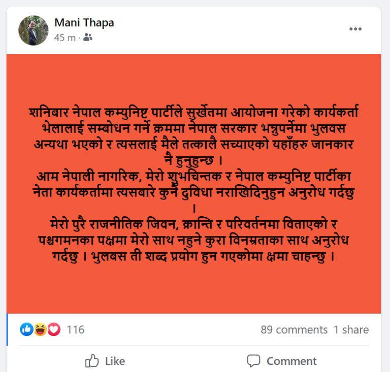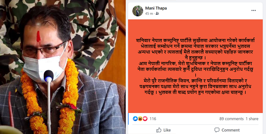 ‘मेरो पूरै राजनीतिक जीवन क्रान्ति र परिवर्तनमा बिताएको र पश्चगमनका पक्षमा मेरो साथ नहुने कुरा विनम्रताका साथ अनुरोध गर्दछु’ थापाले फेसबुकमा लेखेका छन्, ‘भुलबस ती शब्द प्रयोग हुन गएकोमा क्षमा चाहन्छु ।’