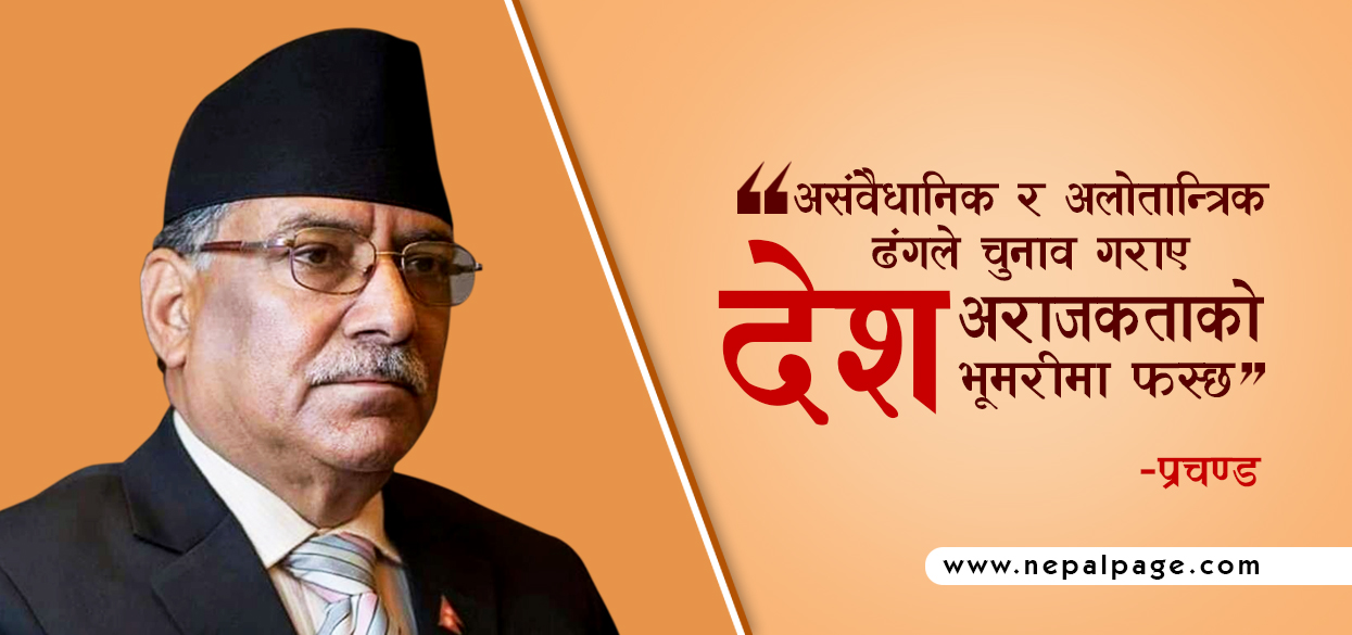 प्रचण्डले आफू शान्तिपूर्ण राजनीति गर्न प्रतिबद्ध रहेको बताउँदै अतिवादमा नजाने जिकिर गरे । ‘असंवैधानिक र अलोतान्त्रिक ढंगले चुनाव गराए देश अराजकताको भूमरीमा फस्छ,’ उनले भने, ‘प्रचण्ड त्यसमा जाँदैन, म शान्तिपूर्ण राजनीतिमा रहन्छु अतिवादमा जान्नँ ।’