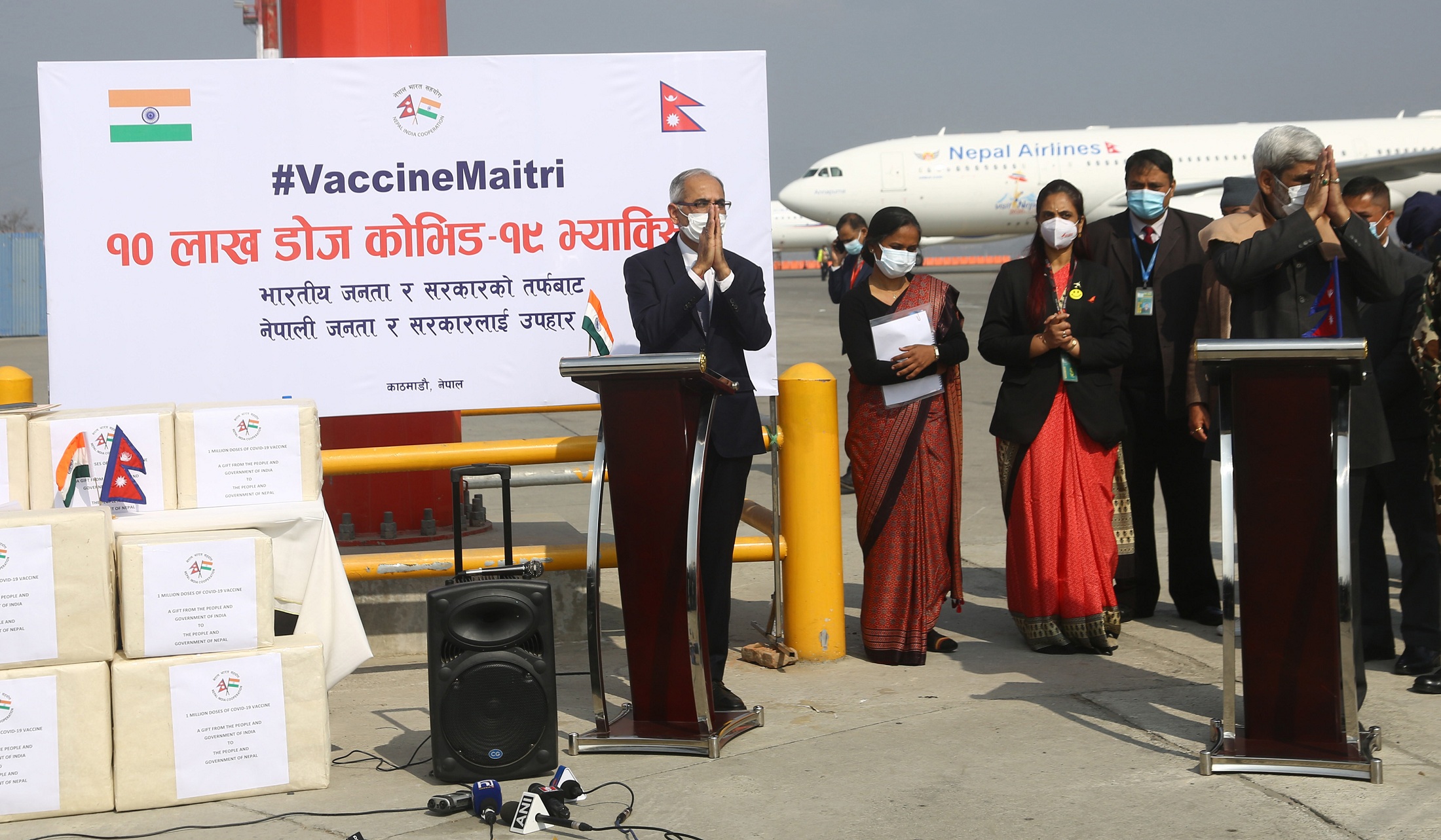 कोरोनाविरुद्धको १० लाख डोज कोभिशिल्ड खोप दिउ“सो एयर इन्डियाको विमानमार्फत काठमाडौं आइपुगेको स्वास्थ्य तथा जनसंख्या मन्त्रालयले जनाएको छ । खोप उत्पादन कम्पनी सिरम इन्स्टिच्युट अफ इण्डियासंग २० लाख डोज खोप किन्ने सहमतिअनुसार १० लाख डोज खोप आएकोे मन्त्रालयले जनाएको छ । बांकी खोप पनि आपूर्ति तालिकाअनुसार आउनेछ । आज काठमाडौं आइपुगेको १० लाख डोज खोपलाई टेकुमा रहेको चिस्यान केन्द्रमा भण्डारण गरिनेछ ।