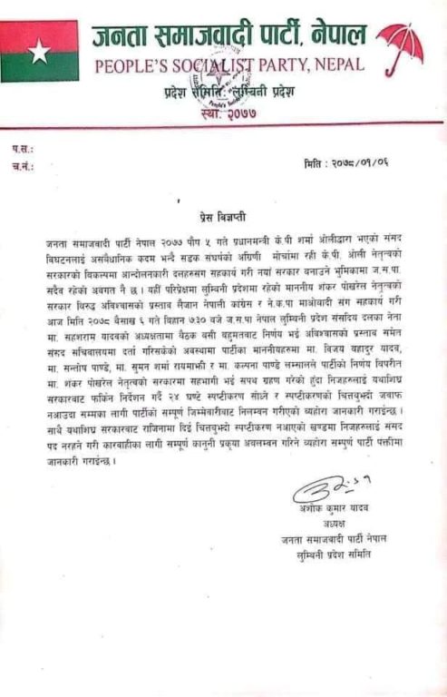जसपा लुम्विनी प्रदेश अध्यक्ष अशोककुमार यादवले प्रेस विज्ञप्ति जारी गर्दै मन्त्री बनेका चार जनालाई यथाशीघ्र सरकारबाट फर्किन निर्देशन दिएका छन् । यादवले उनीहरुलाई २४ घण्टे स्पष्टीकरण सोधिएको जानकारी समेत बताएका छन् ।