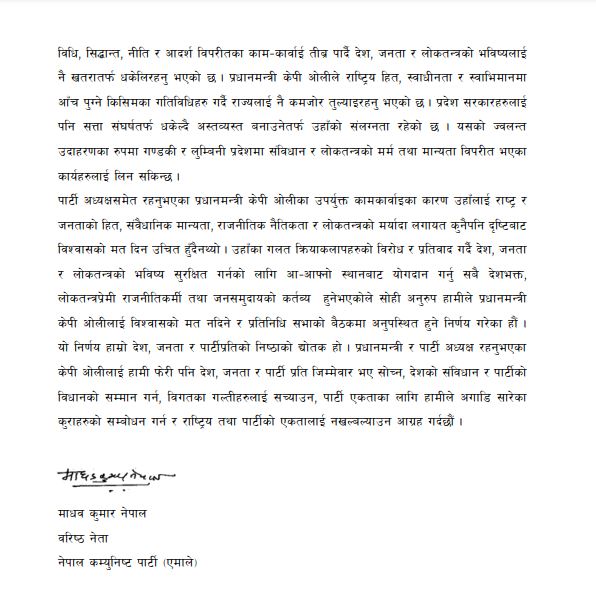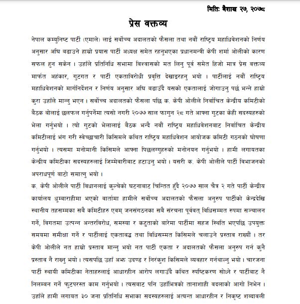 नेपाल कम्युनिष्ट पार्टी (एमाले) लाई सर्वोच्च अदालतको फैसला तथा नवौं राष्ट्रिय महाधिवेशनको निर्णय अनुसार अघि बढाउने हाम्रो प्रयास पार्टी अध्यक्ष समेत रहनुभएका प्रधानमन्त्री केपी शर्मा ओलीको कारण सफल हुन सकेन । उहाँले प्रतिनिधि सभामा विश्वासको मत लिनु पूर्व समेत हिजो मात्र प्रेस वक्तव्य मार्फत अहंकार, गुटगत र पार्टी एकताविरोधी प्रवृत्ति देखाइरहनु भयो ।