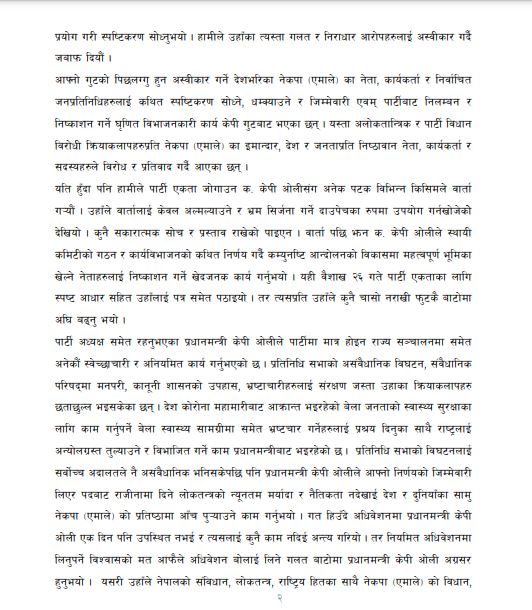 गत हिउँदे अधिवेशनमा प्रधानमन्त्री केपी ओली एक दिन पनि उपस्थित नभई र त्यसलाई कुनै काम नदिई अन्त्य गरियो । तर नियमित अधिवेशनमा लिनुपर्ने विश्वासको मत आफैले अधिवेशन बोलाई लिने गलत बाटोमा प्रधानमन्त्री केपी ओली अग्रसर हुनुभयो । यसरी उहाँले नेपालको संविधान, लोकतन्त्र, राष्ट्रिय हितका साथै नेकपा (एमाले) को विधान, विधि, सिद्धान्त, नीति र आदर्श विपरीतका काम–कार्वाई तीब्र पार्दै देश, जनता र लोकतन्त्रको भविष्यलाई नै खतरातर्फ धकेलिरहनु भएको छ ।