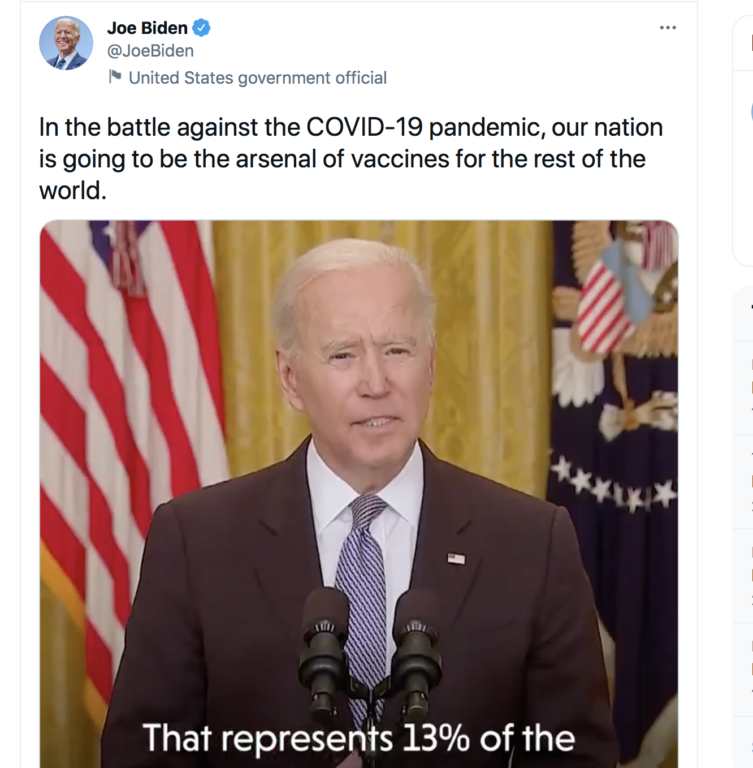 बाइडेनले गत साता संसारका ४० प्रतिशत देशबाट नेताहरूले खोपको लागि आफ्नो प्रशासनलाई सम्पर्क गरेको बताएका थिए।