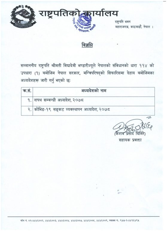 शपथ सम्बन्धी अध्यादेश, २०७८ र कोभिड–१९ संकट व्यवस्थापन अध्यादेश, २०७८ जारी भएका छन् ।