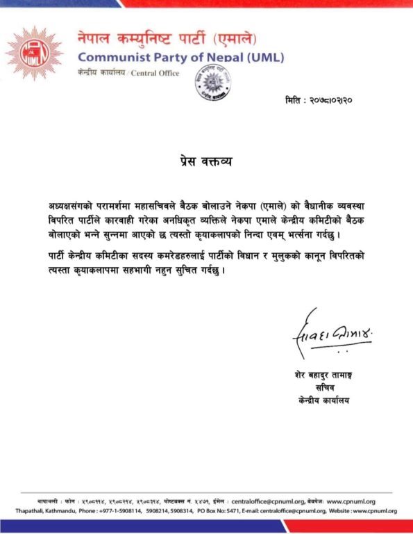 नेपाल–खनालसमूह पक्षले आज आफू निकट केन्द्रीय कमिटी बैठक बोलाएको छ ।“अध्यक्षसँगको परामर्शमा महासचिवले बैठक बोलाउने एमालेको वैधानिक व्यवस्था विपरीत पार्टीले कारवाही गरेका अनधिकृत व्यक्तिले एमाले केन्द्रीय कमिटीको बैठक बोलाएको भन्ने सुन्नमा आएको छ, त्यस्तो क्रियाकलापको निन्दा एवं भत्र्सना गर्दछु”, विज्ञप्तिमा भनिएको छ, “पार्टी केन्द्रीय कमिटीका सदस्य कमरेडलाई पार्टीको विधान र मुलुकको कानून विपरीतको त्यस्ता क्रियाकलापमा सहभागी नहुन सुचित गर्दछु ।”