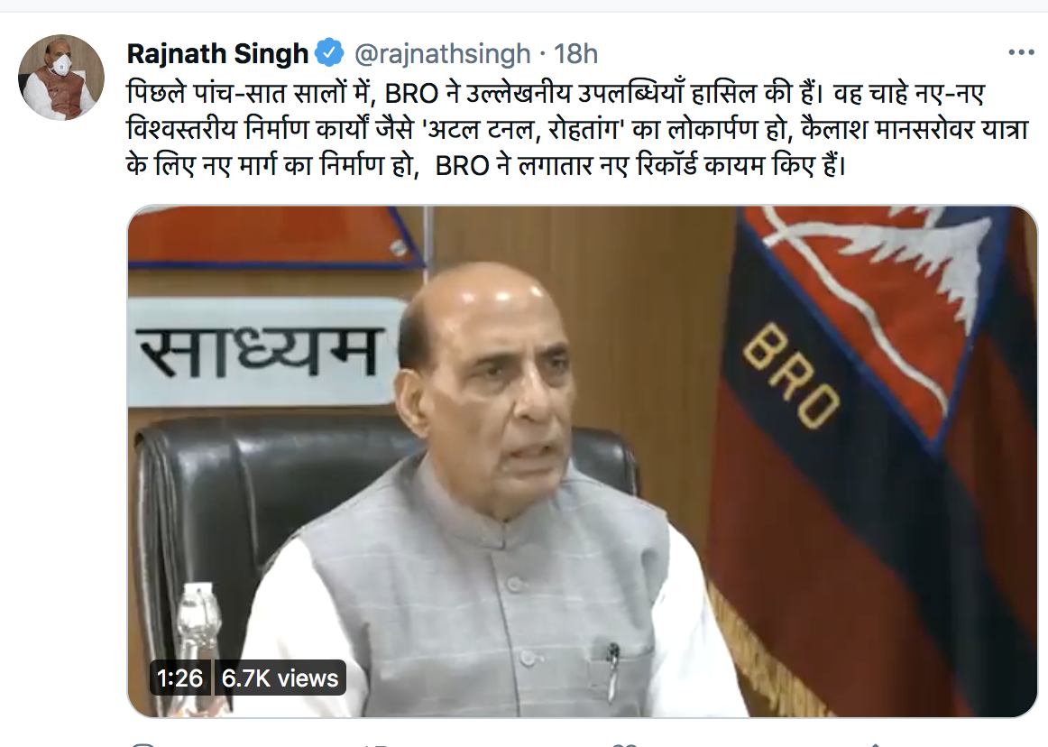 सिंहले नै २०७७ वैशाख २६ मा दिल्लीबाटै यो बाटो निर्माण शुभारम्भ गरेका थिए । शुक्रबार उनले नै नयाँदिल्लीबाट बीआरओलाई सम्बोधन गर्दै भने, ‘पछिल्ला पाँच–सात वर्षमा बीआरओले उल्लेखनीय उपलब्धि गर्यो । चाहे यो अटल टर्नेल रोहताजस्ता नयाँ विश्वस्तरीय निर्माण थालनी होस् वा कैलाश मानसरोवर यात्राका लागि नयाँ मार्ग निर्माण होस्, बीआरओले नयाँ रेकर्ड कायम गरेको छ ।’