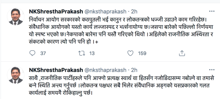 “निर्वाचन आयोग सरकारको कठपुतली भई कानुन र लोकतन्त्रको धज्जी उडाउने काम गरिरहेछ । संवैधानिक आयोगको यस्तो कार्य लज्जास्पद र भर्त्सनायोग्य छ । जसपाबारेको पछिल्लो निर्णयमा यो स्पष्ट भएको छ । नेकपाको बारेमा पनि यस्तै गरिएको थियो । अहिलेको राजनीतिक अस्थिरता र संकटको कारण त्यो पनि पनि हो,” श्रेष्ठले लेखेका छन् ।