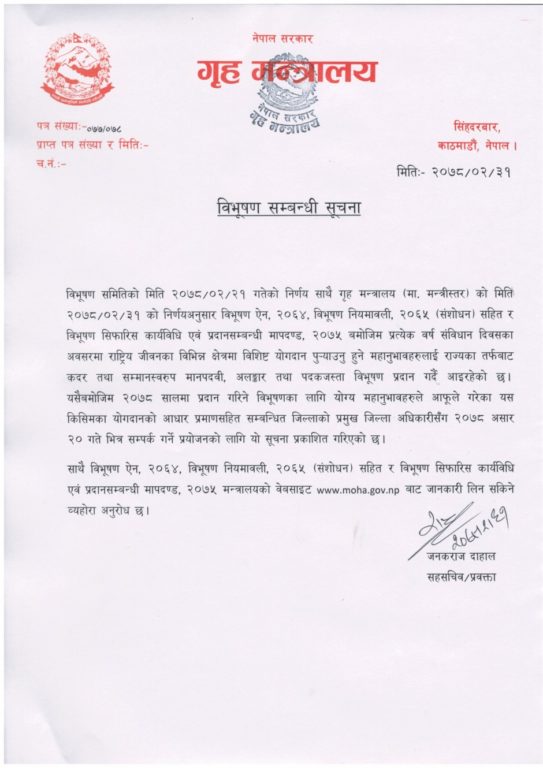 काठमाडौं, ३ असार । सरकारले प्रदान गर्दै आएको विभूषणका लागि दाबी गर्न आह्वान गरेको छ। गृह मन्त्रालयले एक प्रेस विज्ञप्तिमा जारी गर्दै विभूषण समितिको मिति २०७८ जेठ २१ गतेको निर्णय र गृह मन्त्रालयको मिति २०७८ जेठ ३१ गते को निर्णयअनुसार विभूषण ऐन, २०६४, विभूषण नियमावली, २०६५ ९संशोधन०सहित र विभूषण सिफारिस कार्यविधि एवं प्रदानसम्बन्धी मापदण्ड, २०७५ बमोजिम प्रत्येक वर्ष संविधान दिवसका अवसरमा राष्ट्रिय जीवनका विभिन्न क्षेत्रमा विशिष्ट योगदान पुर्याउने महानुभावहरुलाई राज्यका तर्फबाट कदर तथा सम्मानस्वरुप मान पदवी, अलङ्कार तथा पदकजस्ता विभूषण प्रदान गर्दै आएको छ विज्ञप्तिमा भनिएको छ, यसैबमोजिम २०७८ सालमा प्रदान गरिने विभूषणका लागि योग्य महानुभावहरुले आफूले गरेको यस किसिमको योगदानको आधार प्रमाणसहित सम्बन्धित जिल्लाको प्रमुख जिल्ला अधिकारीसँग २०७८ असार २० गतेभित्र सम्पर्क गर्ने प्रायोजनका लागि यो सूचना प्रकाशित गरिएको छ।