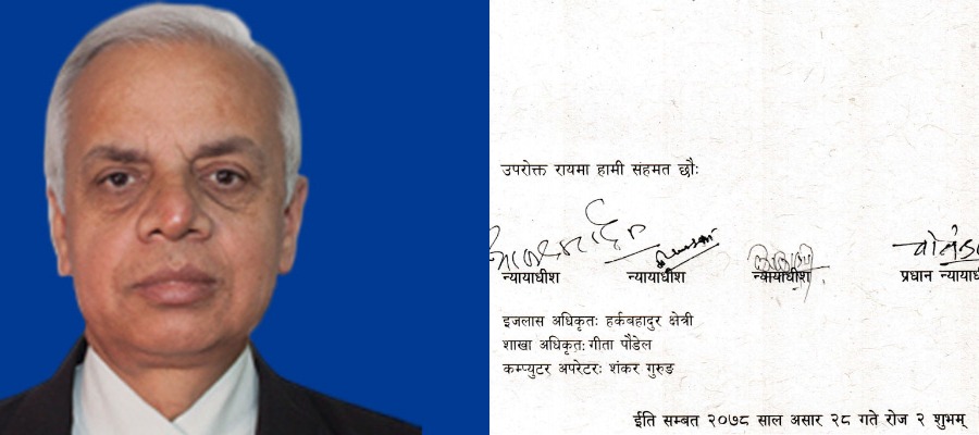 फैसला मस्यौदा गरेको उनैले भए पनि यसको विषयवस्तुमा भने अरू सबै न्यायाधीशको राय उत्तिकै महत्वपूर्ण हुन्छ। उनले लेखेको भएर फैसलाको अन्त्यमा उनको हस्ताक्षर सबभन्दा पहिले छ। त्यसपछि संवैधानिक इजलासका अरू न्यायाधीश आनन्दमोहन भट्टराई, दीपककुमार कार्की, मिरा खड्का र अन्त्यमा प्रधानन्यायाधीश चोलेन्द्रसमशेर जबराको हस्ताक्षर छ।
