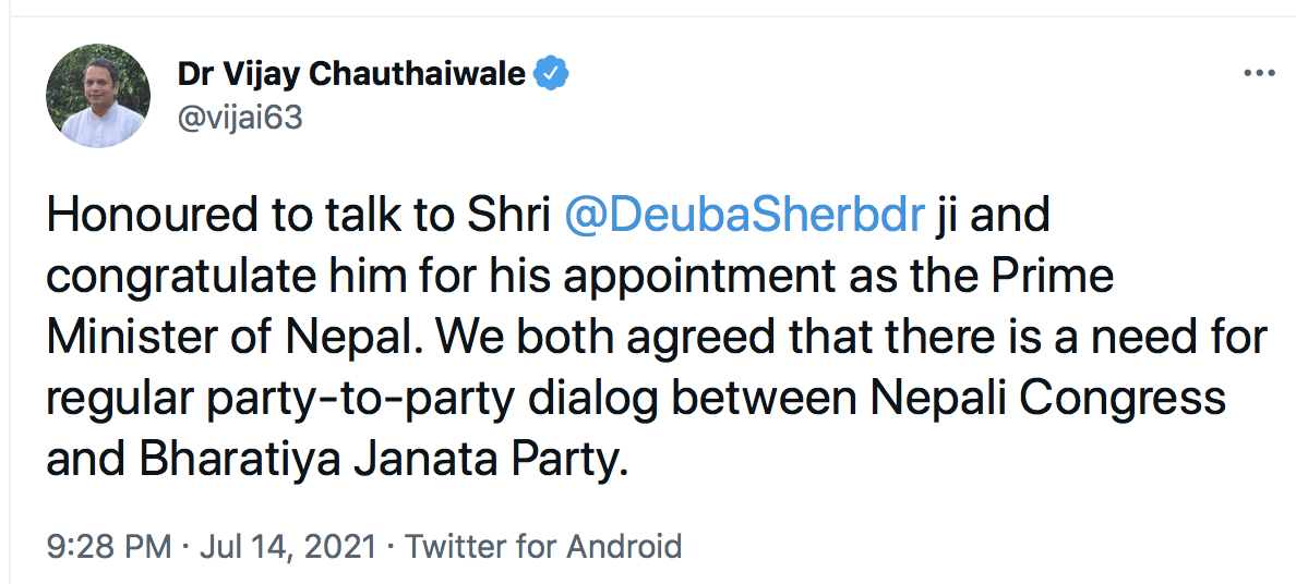 प्रधानमन्त्री देउवालाई भाजपा विदेश विभाग प्रमुखको बधाई, चीन अझै हेर्ने मुडमा !
