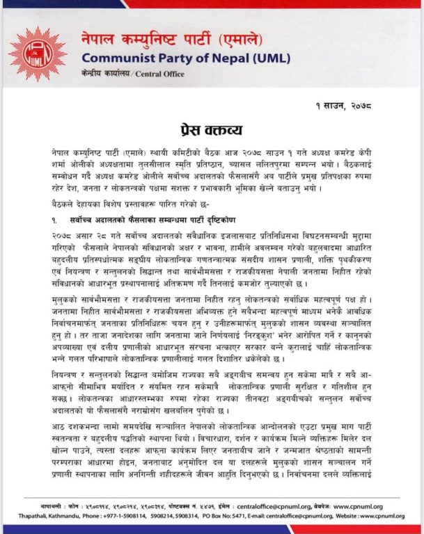 काठमाडौँ, १ साउन । नेकपा एमालेले सर्वोच्च अदालतलको असार २८ गतेको फैसलालले देशलाई गलत दिशातिर लैजाने ठहर गरेको छ। शुक्रबार ललितपुको च्यासलस्थित तुल्सीलाल स्मृति प्रतिष्ठानको भवनमा बसेको स्थायी कमिटी बैठकले यस्तो निष्कर्ष निकालेको हो।बैठकपछि बोल्दै एमाले प्रवक्ता प्रदीप ज्ञवालीले प्रतिनिधिसभा विघटनविरुद्ध सर्वोच्च अदालतले दिएको फैसला बहुलबादमा आधारित नभएको निचोड बैठकले निकालेको जानकारी दिए। प्रतिनिधिसभा विघटनसम्बन्धी मुद्दामा आधारित सर्वोच्च अदालतको असार २८ को फैसला नेपालको बहुलबादमा आधारित छैनु, ज्ञवालीले भने, सार्वभौम सत्ता जनतामा रहेको कुरालाई यो फैसलाले अतिक्रमण गरेको छ। ताजा जनादेशमा जाने निर्णयलाई निरंकुश मानिनु बेठीक हो। यसले लोकतान्त्रिक प्रणालीलाई गलत दिशातिर लैजान्छ।