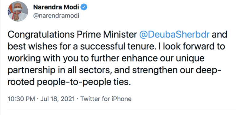 प्रधानमन्त्री नियुक्त भएको एक हप्ता सम्म मोदीको बधाइ नआएको विषय नेपालमा निकै चर्चा भएको बेला आज मोदीले देउवालाई बधाई दिएका हुन् ।
