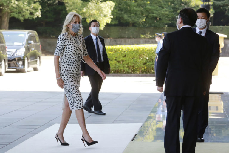 U.S. first lady Jill Biden arrives at Imperial Palace to meet Japan’s Emperor Naruhito in Tokyo, Friday, July 23, 2021. (AP Photo/Koji Sasahara, Pool)