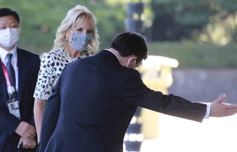 U.S. first lady Jill Biden is shown the way upon arrival at Imperial Palace to meet Japan’s Emperor Naruhito in Tokyo, Friday, July 23, 2021. (AP Photo/Koji Sasahara, Pool)