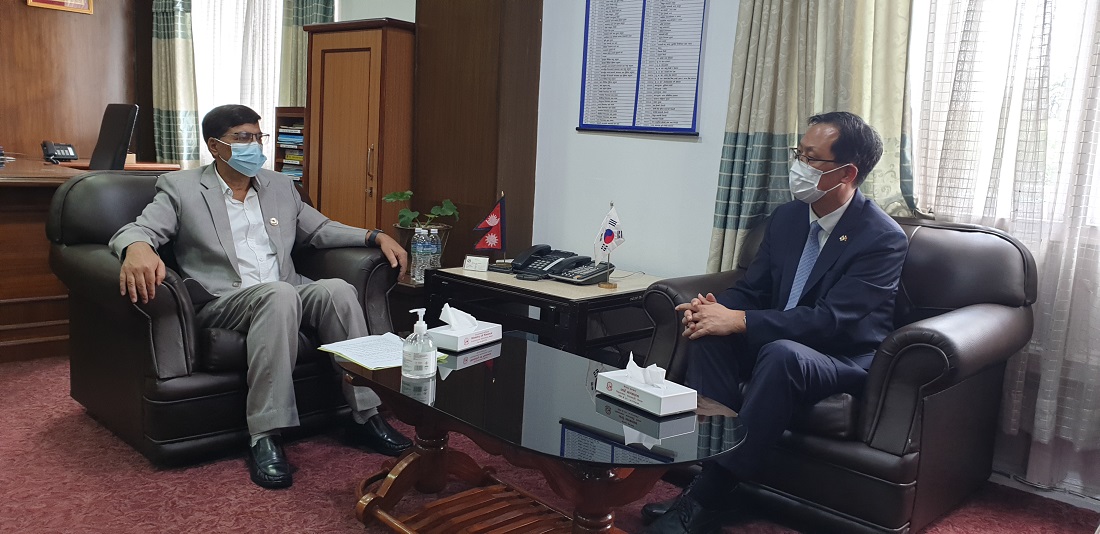 काठमाडौं, १३ साउन । नेपालका लागि दक्षिण कोरियाका राजदूत पार्क चोङ–सुकले अर्थमन्त्री जनार्दन शर्मासँग शिष्टाचार भेटवार्ता गरेका छन्। बुधवार मन्त्रालयमा भएको भेटमा अर्थमन्त्री शर्माले भाषा परीक्षा उत्तिर्ण गरी कोरिया जान नपाएका युवालाई काम गर्ने वातावरण बनाइदिन आग्रह गरे। कोभिड महामारीका कारण रोकिएको प्रक्रिया चाँडै अघि बढाउन सरकारको तर्फबाट हुनुपर्ने काम गरिने प्रतिवद्धता जनाउँदै मन्त्री शर्माले कोरियाको तर्फबाट आवश्यक प्रक्रिया अघि बढाइदिन आग्रह गरे।