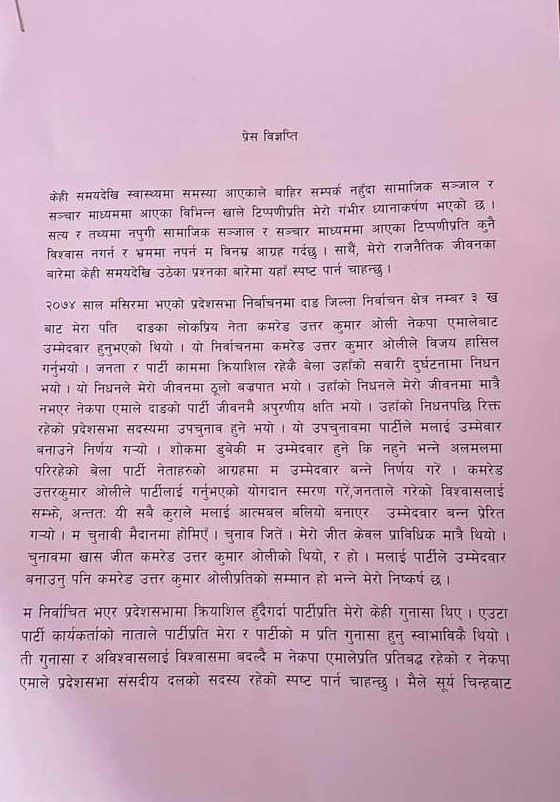 एमालेमै फर्किइन् लुम्बिनीकी सांसद विमलाकुमारी ओली (पत्रसहित)