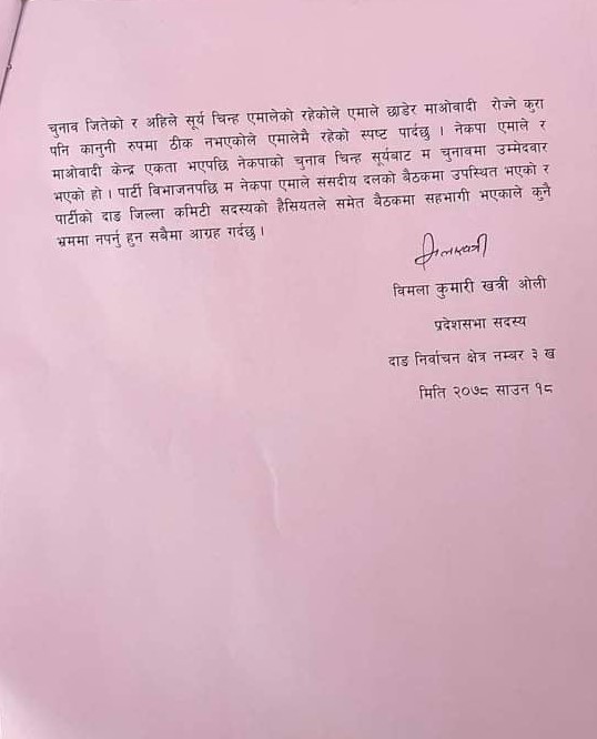 आफू सूर्य चिन्हबाट चुनाव जितेको र अहिले सूर्य चिन्ह एमालेको रहेको हुँदा माओवादी रोज्ने कुरा कानुनी रूपमा ठिक नभएकोले एमालेमा रहेको उनले स्पष्ट पारेकी छन्। ुमैले सूर्य चिन्हबाट चुनाव जितेको र अहिले सूर्य चिन्ह एमालेको रहेकोले एमाले छाडेर माओवादी रोज्ने कुरा पनि कानुनी रूपमा ठिक नभएकोले एमालेमै रहेको स्पष्ट पार्दछु। नेकपा एमाले र माओवादी केन्द्र एकता भएपछि नेकपाको चुनाव चिन्ह सूर्यबाट म चुनावमा उम्मेदवार भएको हो। पार्टी विभाजनपछि म नेकपा एमाले संसदीय दलको बैठकमा उपस्थित भएको र पार्टीको दाङ जिल्ला कमिटी सदस्यको हैसियतले समेत बैठकमा सहभागी भएकाले कुनै भ्रममा नपर्नु हुन सबैमा आग्रह गर्दछु। कसैको सम्पर्कमा नआएपछि उनलाई एमालेका नेताहरूले बन्धक बनाएको भन्ने आरोप समेत लगाएका थिए। तर उनले आफ्नो स्वास्थ्यको समस्याका कारण सम्पर्क बाहिर रहेको बताएकी छन्।