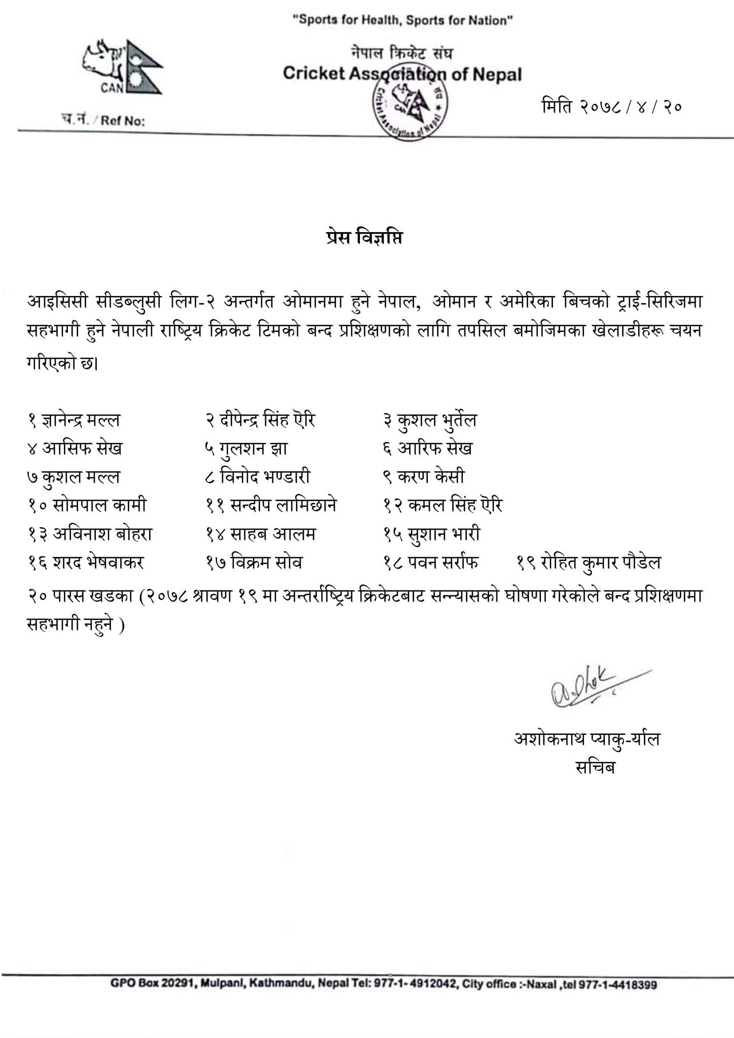 क्यानले बुधबार बन्द प्रशिक्षणका लागि १९ खेलाडीलाई टिममा बोलाएको हो । क्यानले बोलाएको बन्द प्रशिक्षणमा गुलशन झा पहिलो पटक परेका छन् । उनले मेयर्स कप एकदिवसीय क्रिकेटमा उत्कृष्ट प्रदर्शन गरेका थिए । क्यानले नेपाली टोलीको बन्द प्रशिक्षण बिहीबारबाट सुरु हुने जनाएको छ । प्रशिक्षणमा सहभागी हुने सबैको पीसीआर परिक्षण भईसकेको क्यानले जनाएको छ ।सिरिजको तयारीका लागि मुख्य प्रशिक्षक डेभ वाटमोर नेपाल आईसकेका छन् ।नेपाल, ओमान र अमेरिकाबीचको सिरिज आगामी सेप्टेम्बरमा ओमानमा हुनेछ ।लिग–२ अन्तर्गत नेपालले यस अघि घरेलु मैदानमा ओमान र अमेरिकासँग ४ खेल खेलिसकेको छ ।लिगमा नेपालले ४ खेलमा ४ अंक जोडेको छ । नेपाल छैटौं स्थानमा रहेको छ ।