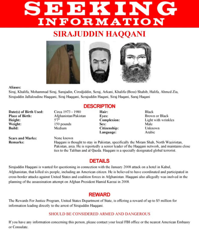 अमेरिकाले सिराजुद्दीन हक्कानी सम्बन्धी निकालेको सूचना ।