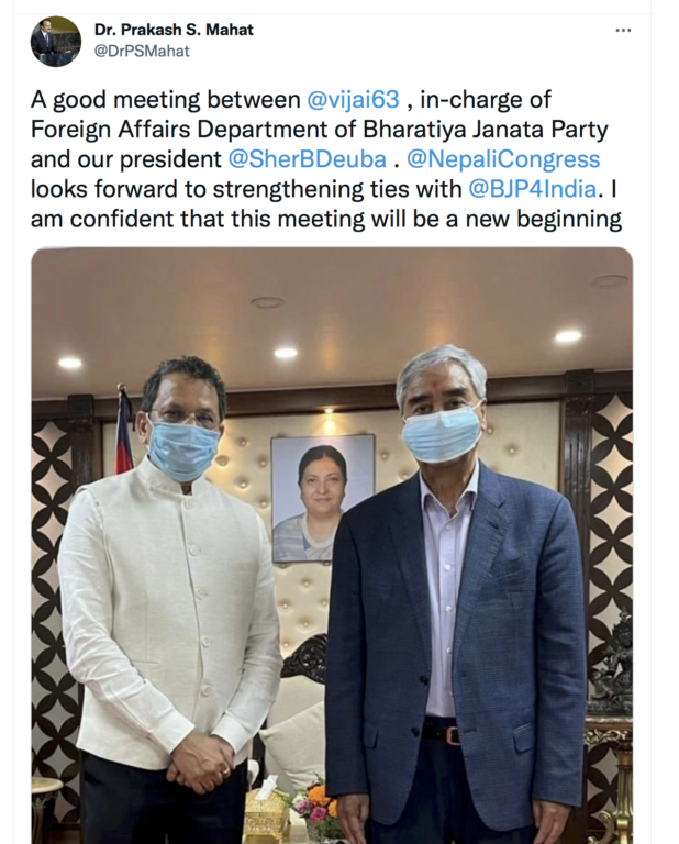 कांग्रेस सह–महामन्त्री एवं पूर्वपरराष्ट्रमन्त्री प्रकाशसरण महतले प्रधानमन्त्री र चौथाइवालेबीच भेटवार्ता अत्यन्तै उपलव्धी मूलक भएको बताए । दुई पार्टीबीचको सम्बन्धलाई कसरी दुई देशको हितमा उपयोग गर्न सकिन्छ ? भन्ने विषयमा भाजपा र नेकांबीच पनि छलफल भइरहेको उनले बताए । ‘महतले भने उहाँलाई नेपाल भ्रमणको लागि मैले कांग्रेसको तर्फबाट निमन्त्रणा दिएको थिएँ । त्यही सिलसिलामा उहाँ नेपाल आउनुभएको हो । उहाँको यो भ्रमण मुख्यतः भाजपा र कांग्रेसको सम्बन्ध विस्तार र नेपाल–भारत सम्बन्धलाई कसरी बलियो पार्ने ? भन्ने सम्बन्धमै केन्द्रित हुन्छ,’ । महतले आइतबारको भेटवार्ताले नेपाली कांग्रेस र भाजपाबीचको सम्बन्धलाई नयाँ उचाईमा पुर्याउने विश्वास व्यक्त गरे । भाजपाले नेपालक राजनीतिक पार्टीहरुबीच पार्टी पार्टीसस्तरमा सम्वन्ध विस्तार गर्ने योजना बनाएको दिल्ली स्थित स्रोतले बताएको छ ।