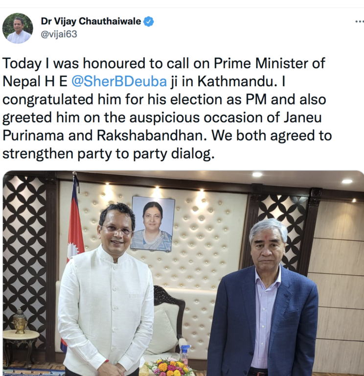 देउवा प्रधानमन्त्री भएपछि भारतीय समकक्षी मोदीसँग टेलिफोनमा कुराकानी भएलगत्तै चौथाईवालेले पनि देउवासँग संवाद गरेका थिए । भारतीय संस्थपनका तर्फबाट नेपाल मामिला हेर्ने जिम्मेवारी चौथाइवालेको नै रहेको छ ।