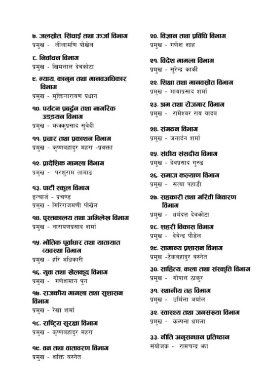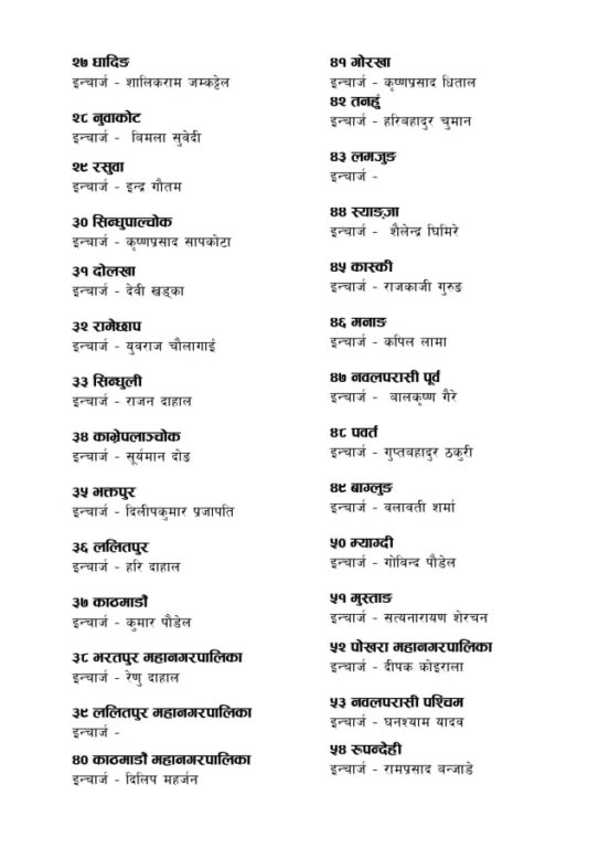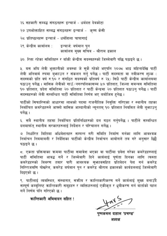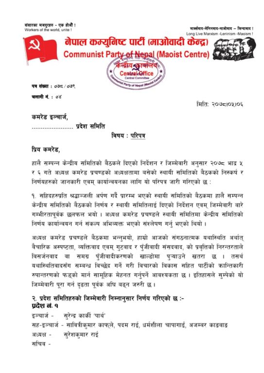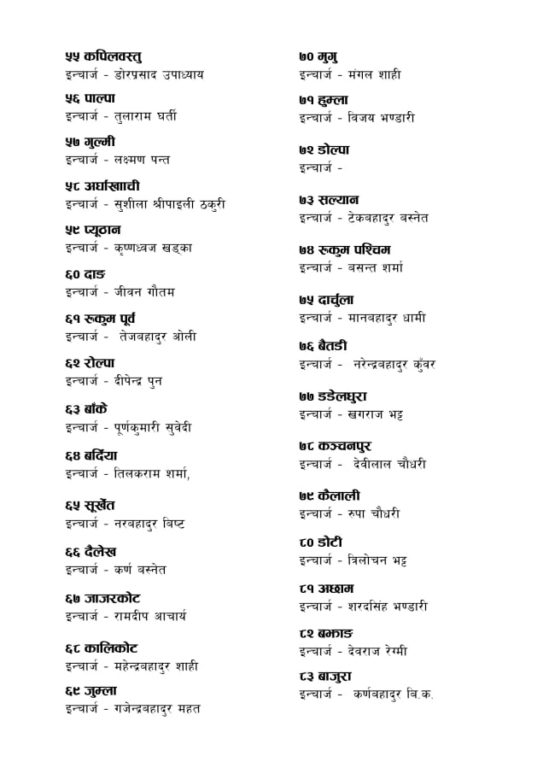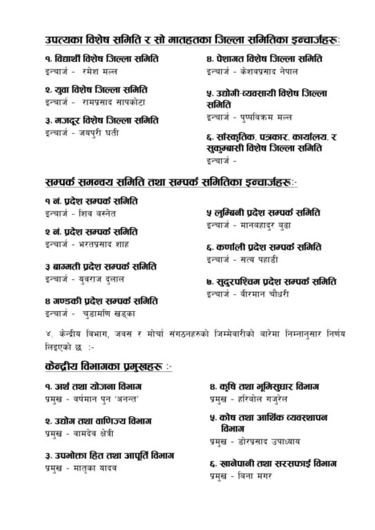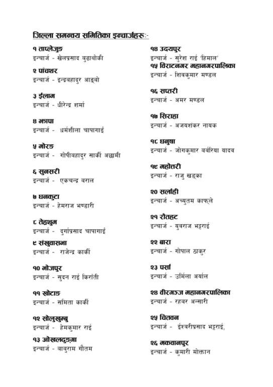त्यस्तै माओवादीले देशभरका जिल्ला समन्वय समितिको इन्चार्ज पनि तोकेको छ। संघीय संरचना अनुसार अभ्यास गर्ने क्रममा माओवादीले जिल्ला कमिटी भंग गरेर समन्वय समिति निर्माण गर्ने निर्णय यसअघि नै लिइसकेको छ।