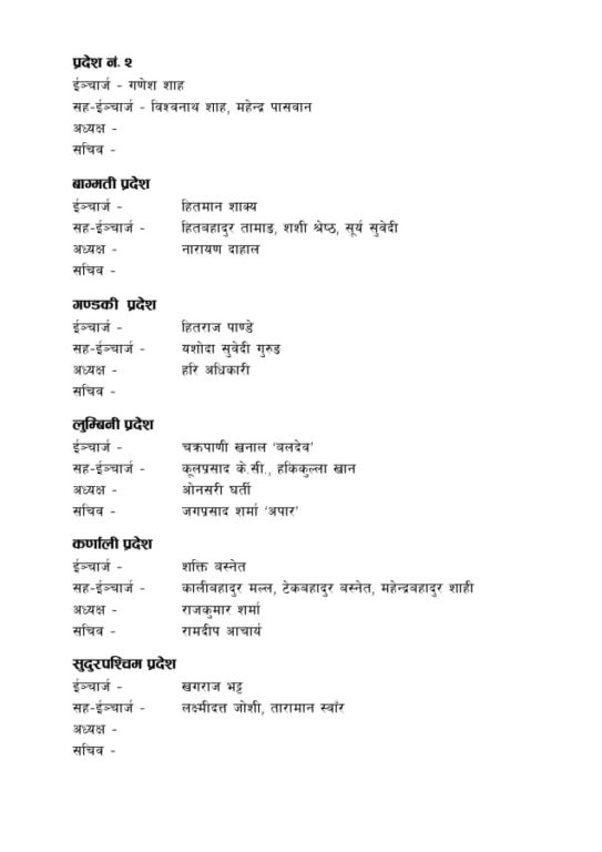 लुम्बिनी प्रदेश इन्चार्जमा चक्रपाणि खनाल बलदेव चयन हुँदा सह-इन्चर्जमा कुलप्रसाद केसी र हरिकुल्ला खान चयन भएका छन्। यो प्रदेशको अध्यक्षमा ओनसरी घर्ती चयन हुँदा सचिवामा जगतप्रसाद शर्मा अपारुले जिम्मेवारी पाएका छन्।