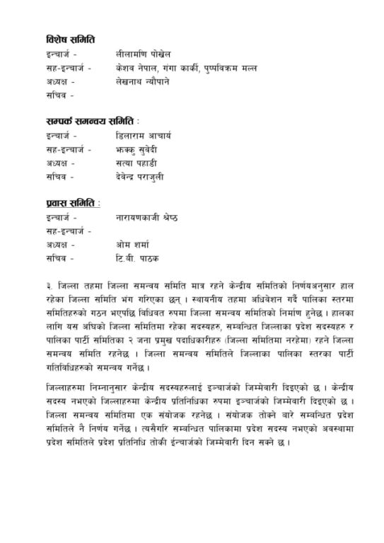 त्यस्तै विशेष समिति इन्चार्जको भूमिमा लीलामणि पोखरेल आएका छन्। यो समितिको सह(इन्चार्जमा केशव नेपाल, गंगा कार्की र पुष्पविक्रम मल्ल तोकिएका छन्। अध्यक्षमा लेखनाथ न्यौपाने रहेका छन्।