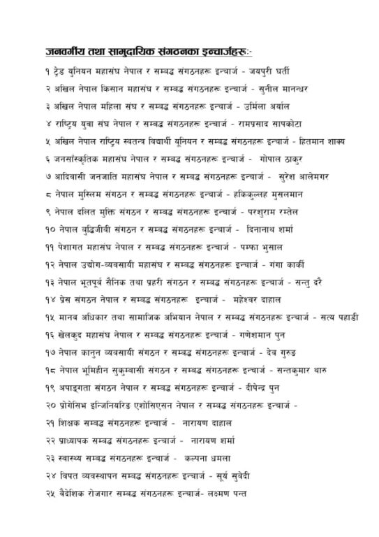 उता सम्पर्क समन्वय समिति इन्चार्जमा डिलाराम आचार्य, सह-इन्चार्जमा झक्कु सुवेदी तोकिँदा अध्यक्षमा सत्या पहाडी र सचिवामा देवेन्द्र पराजुलीलाई जिम्मेवारी दिइएको छ।