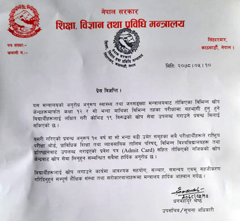 काठमाडौं, १० भदौ । सरकारले कक्षा १२ भन्दा माथिल्लो तहका परीक्षामा सहभागी हुने विद्यार्थीलाई कोभिड–१९ विरुद्धको खोपको व्यवस्था गरेको छ । शिक्षा, विज्ञान तथा प्रविधि मन्त्रालयका सूचना अधिकारी धनबहादुर श्रेष्ठले बिहीबार विज्ञप्ति जारी गर्दै कक्षा १२ र सोभन्दा माथिका विभिन्न तहमा अध्ययनरत विद्यार्थीका लागि खोप उपलब्ध गराउने प्रबन्ध मिलाइएको जानकारी दिए ।अठार वर्ष वा सोभन्दा बढी उमेर समूहका सबै परीक्षार्थीले राष्ट्रिय परीक्षा बोर्ड, प्राविधिक शिक्षा तथा व्यावसायिक तालिम परिषद्, विभिन्न विश्वविद्यालय तथा प्रतिष्ठानबाट उपलब्ध गराइएको प्रवेशपत्रसहित तोकिएको खोप केन्द्रबाट खोप सेवा लिनहुन अनुरोध गरिन्छु, उनले जारी गरेको विज्ञप्तिमा जनाइएको छ ।