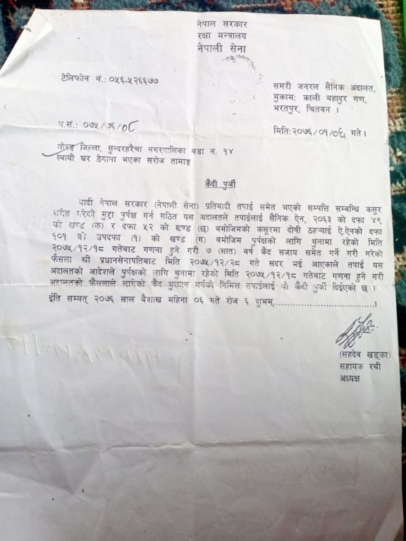 तर, यही ‘गन’ चोरी गरेको अभियोगमा दुई वर्षअघि कालीबहादुर गणमै मुकाम भएको समरी जनरल सैनिक अदालतले उदयपुर, गाईघाटका सैनिक अमल्दार लवकुमार गुरुङ र मोरङ सुन्दरहरैंचाका सरोज तामाङलाई सैनिक ऐन, २०६३ को दफा ४९ को खण्ड (क) र दफा ५२ को खण्ड (६) बमोजिम दोषी ठहर गरी लवकुमारलाई १० वर्ष र सरोजलाई ७ वर्षको कैद सजाय सुनाएको थियो। त्यतिबेला सैनिक अदालतका अध्यक्ष सहायक रथी, सहदेव खड्का थिए। लवकुमार र सरोज अहिले पनि जिल्ला कारागार चितवनमा सजाय काटिरहेका छन्।