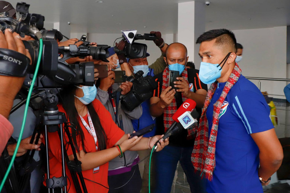 काठमाडौं, १४ भदौ । नेपालसँग तय भएका दुई मैत्रीपूर्ण खेलका लागि भारतीय टोली सोमबार नेपाल आइपुगेको छ । त्रिभुवन अन्तर्राष्ट्रिय विमानस्थलमा ओर्लिएपछि भारतीय टोलीका कप्तान सुनिल क्षेत्रीले नेपाली भाषामा नै सञ्चारमाध्यमलाई प्रतिक्रिया दिए ।