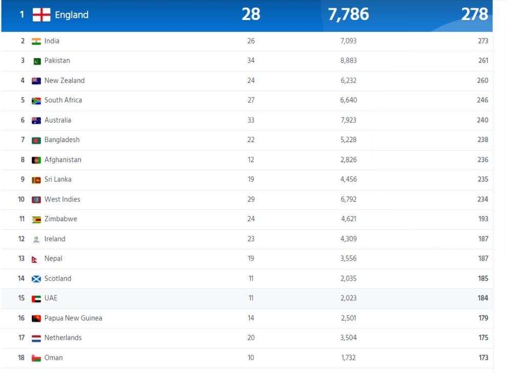 टी(२० नयाँ वरीयताको इंग्ल्यान्ड शीर्ष स्थानमा, भारत दोस्रोमा, पाकिस्तान तेस्रोमा, न्युजिल्याण्ड चौथोमा र दक्षिण अफ्रिका पाँचौ स्थानमा छ । यस्तै अष्ट्रलिया छैटौ, बंगलादेश सातौं, अफगानिस्तान आठौं, श्रीलंका नवौं, वेष्ट इन्डिज दशौँ र जिम्बाव्वे ११औं स्थानमा छ ।